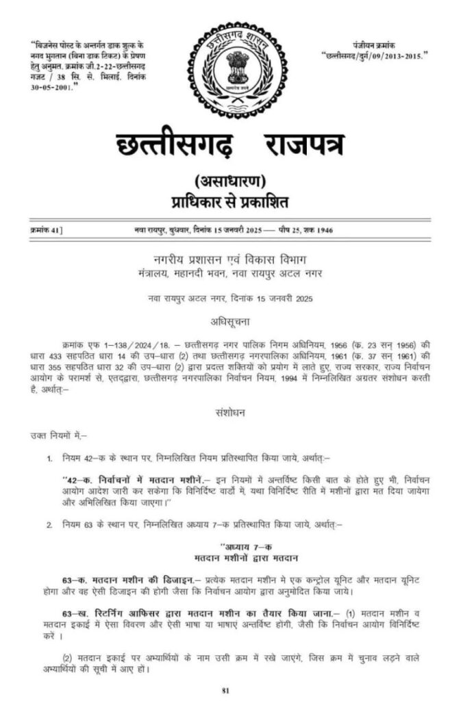 इसी बीच छत्तीसगढ़ सरकार ने नगरीय निकाय के चुनाव मतपत्र के बजाये इलेक्ट्रॉनिक वोटिंग मशीनब से कराये जाने संबंधी अधिसूचना भी जारी कर दी है।