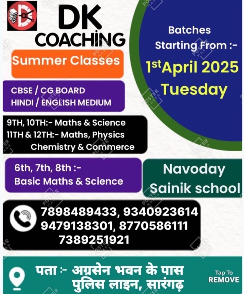 गर्मी की छुट्टियों में बच्चों को कराएं नवोदय तथा सैनिक स्कूल भर्ती परीक्षा को की तैयारी..डी के कोचिंग सेंटर सारंगढ़ में अनुभवी शिक्षक दे रहे मार्गदर्शन..सीटे सीमित, हेतु तत्काल कराएं रजिस्ट्रेशन..