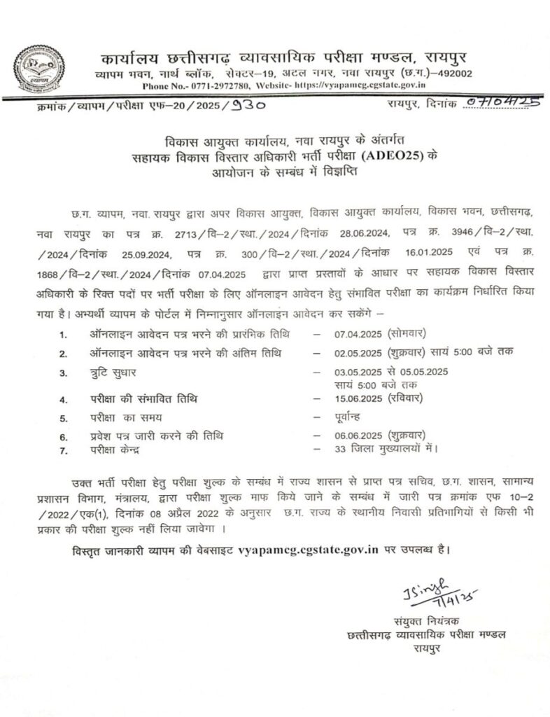 इसके लिए व्यापम द्वारा अभ्यार्थियों से ऑनलाईन आवेदन की तिथि निर्धारित की गई है। सहायक विकास विस्तार अधिकारी भर्ती परीक्षा के लिए ऑनलाईन आवेदन भरने की प्रारंभिक तिथि 07 अप्रैल 2025 से शुरू हो चुकी है तथा अंतिम तिथि 02 मई 2025 को शाम 5 बजे तक निर्धारित की गई है। उक्त भर्ती की त्रुटि सुधार की तिथि 03 मई से 05 मई 2025 तक शाम 5 बजे तक निर्धारित है।