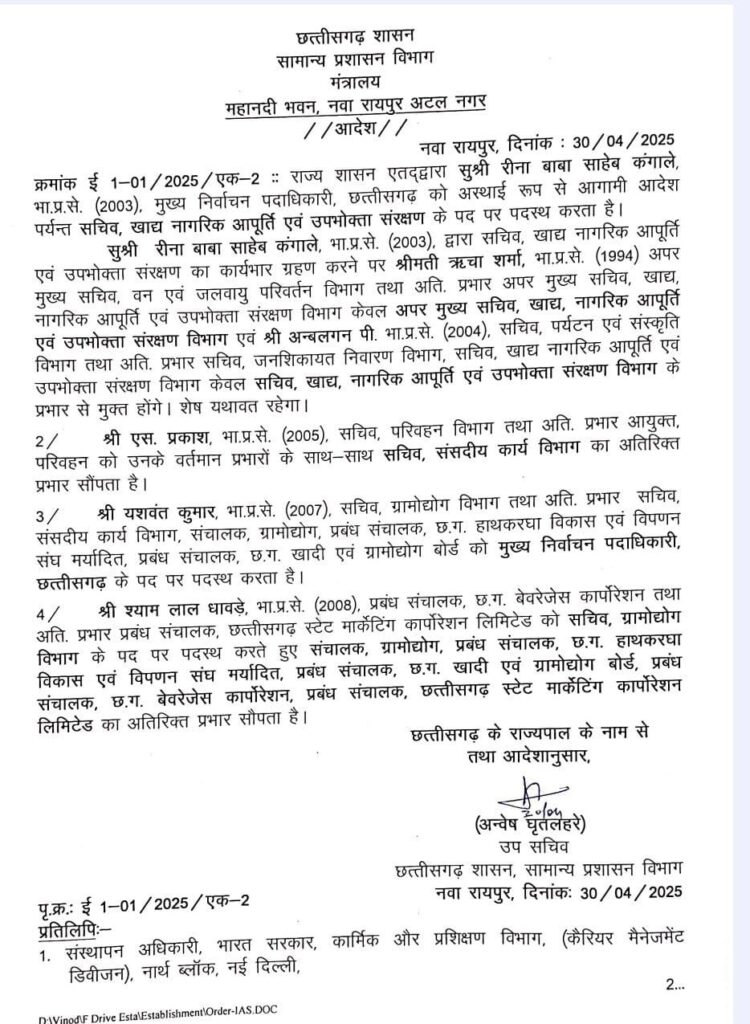 छत्तीसगढ़ में IAS अफसरों का तबादला.. यशवंत कुमार बने प्रदेश के नए मुख्य निर्वाचन पदाधिकारी, देखें आदेश…