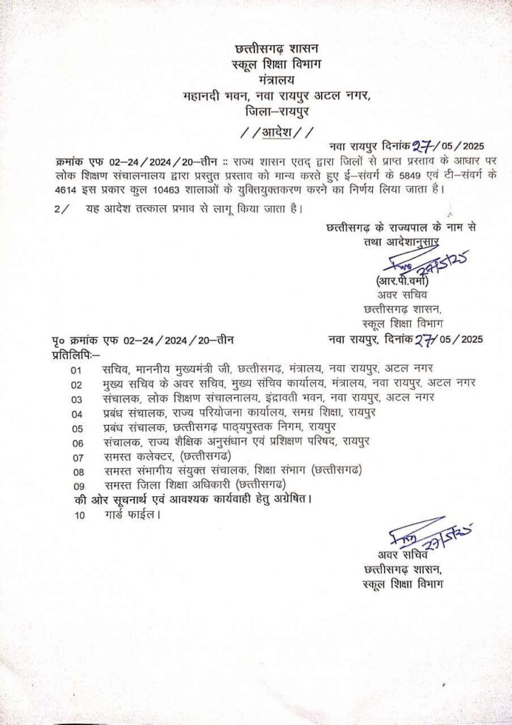 रायपुर: सरकार ने जारी किया स्कूलों के युक्तियुक्तकरण का आदेश.. कल शिक्षक संघ घेरेंगे मंत्रालय, कांग्रेस ने भी साधा निशानाछत्तीसगढ़ सरकार ने शिक्षकों के विरोध के बीच युक्तियुक्तकरण का आदेश जारी कर दिया है। जारी आदेश के मुताबिक़ लोक शिक्षण संचालनालय द्वारा प्रस्तुत प्रस्ताव को मान्य करते हुए ई-संवर्ग के 5849 एवं टी-संवर्ग के 4614 इस प्रकार कुल 10463 शालाओं के युक्तियुक्तकरण करने का निर्णय लिया गया है।