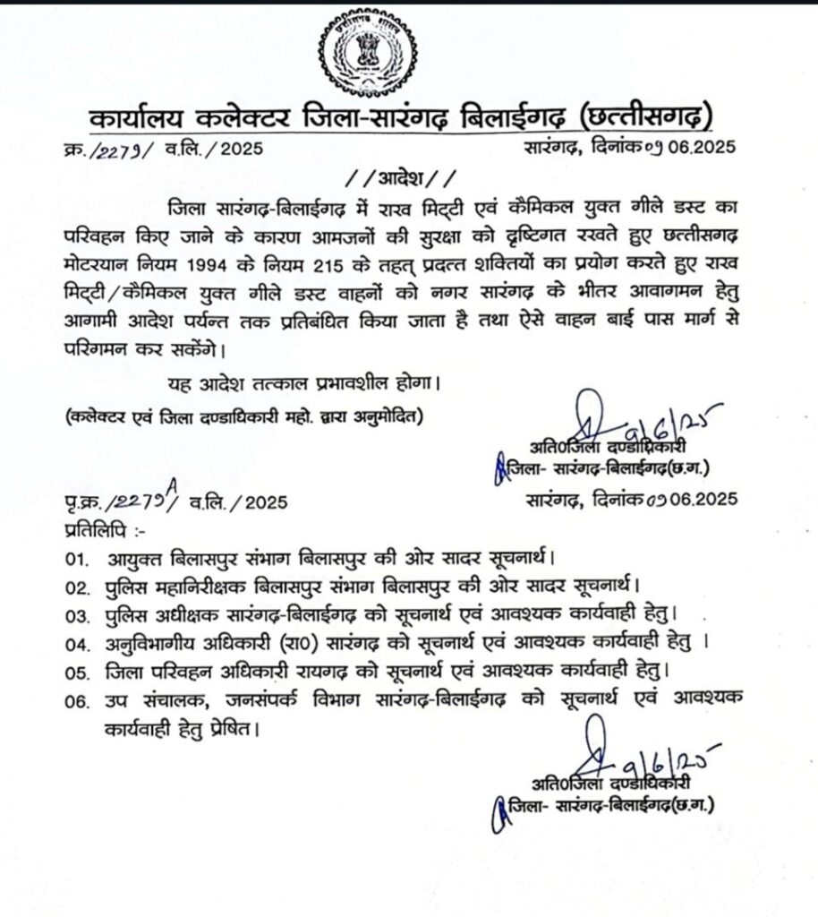 सारंगढ़ शहरी क्षेत्र में राख और केमिकलयुक्त गीला डस्ट के परिवहन पर प्रतिबंध…कलेक्टर कार्यालय सारंगढ़ बिलाईगढ़ से आदेश जारी…