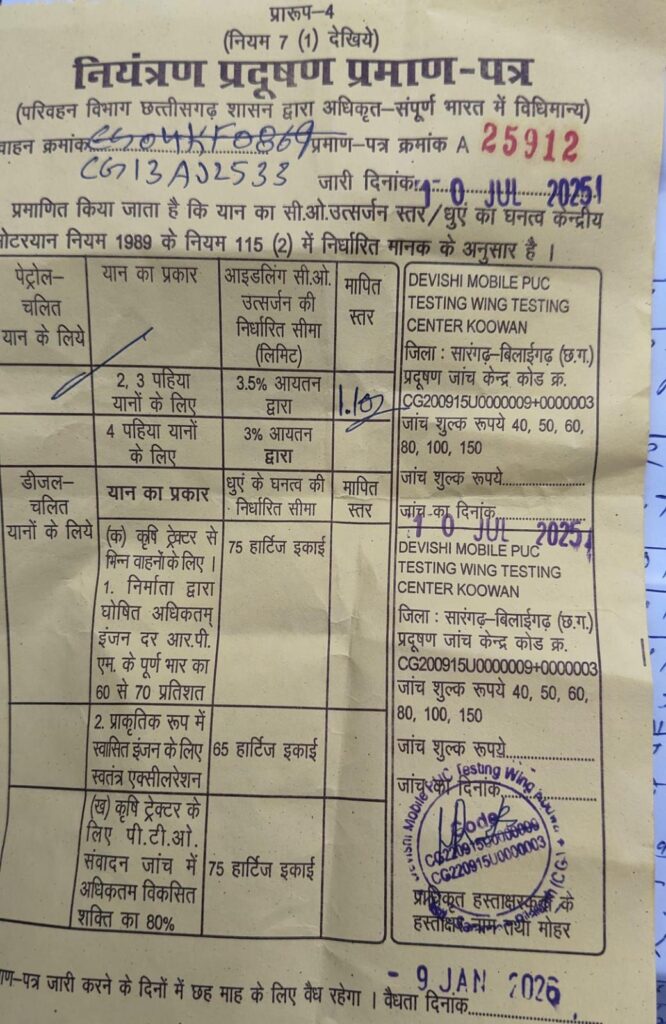 सूत्रों के अनुसार, एक पुरानी ओमनी गाड़ी (क्रमांक CG 04 HD 0288) पर बैनर लगाकर खुद को छत्तीसगढ़ शासन द्वारा अधिकृत चलित प्रदूषण जांच केंद्र बताया जा रहा है। उस पर “छत्तीसगढ़ शासन, परिवहन विभाग द्वारा अधिकृत चलित वाहन प्रदूषण जांच केंद्र, जिला सारंगढ़-बिलाईगढ़” और एक संदिग्ध कोड CG200915U000009+0000003 अंकित किया गया है।