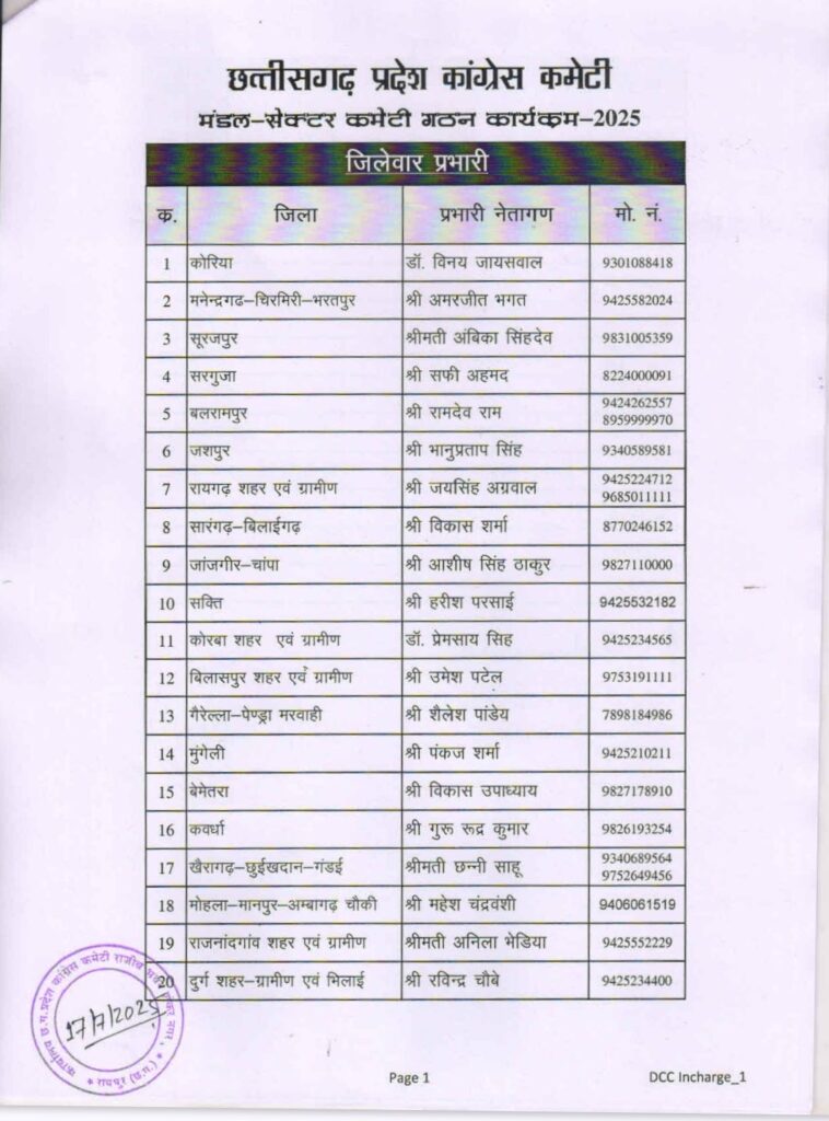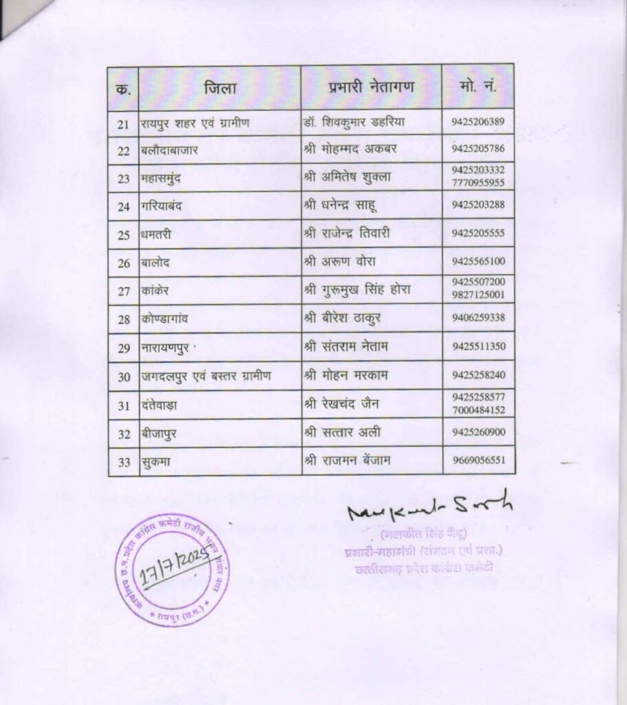 बता दें कि मंडल और सेक्टर कमेटी के पुनर्गठन के लिए कांग्रेस ने जिला प्रभारी नियुक्त किए हैं। पूर्व मंत्री शिव डहरिया रायपुर जिले के प्रभारी बनाए गए हैं। पूर्व मंत्री मोहम्मद अकबर बलौदा बाजार, रविंद्र चौबे दुर्ग भिलाई, उमेश पटेल बिलासपुर, मोहन मरकाम जगदलपुर के प्रभारी बनाए गए हैं। जिसकी पूरी सूची आप नीचे देख सकते हैं।
