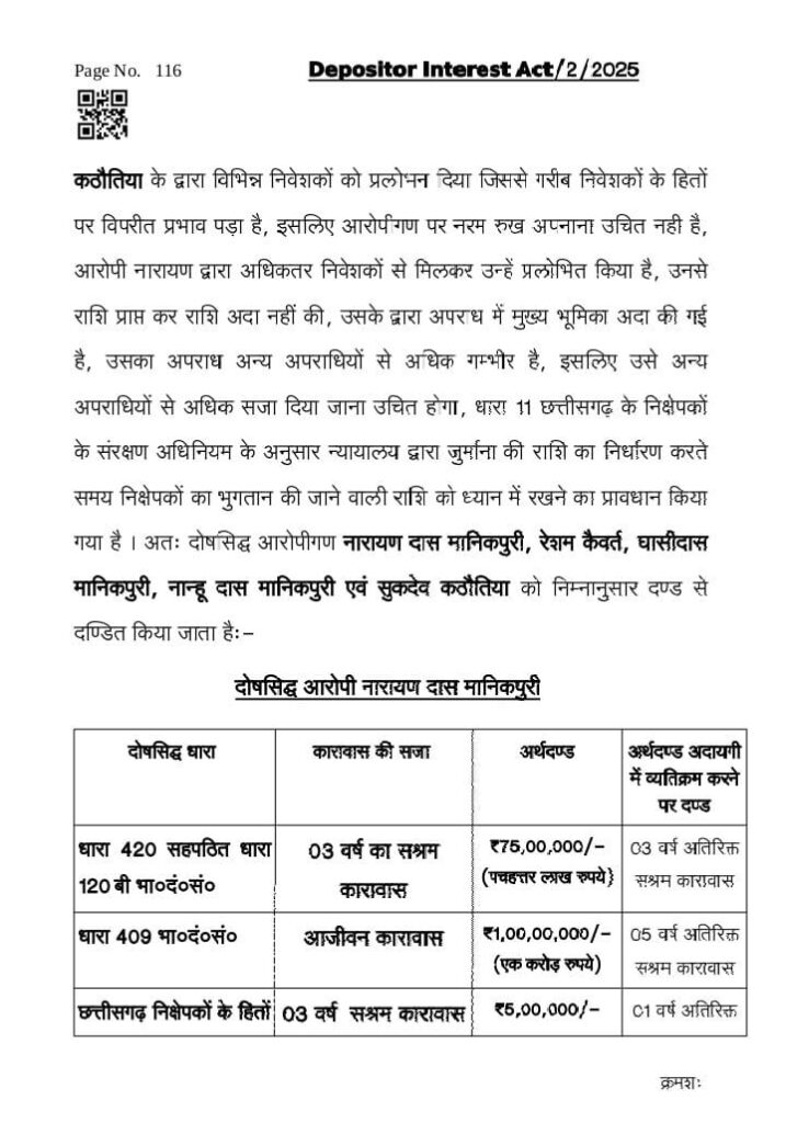 मुख्य आरोपी नारायण मानिकपुरी को भारतीय दंड संहिता की धारा 420 (धोखाधड़ी) के तहत 3 वर्ष सश्रम कारावास एवं ₹75 लाख अर्थदंड धारा 409 (आपराधिक न्यासभंग) के तहत आजीवन कारावास एवं ₹1 करोड़ अर्थदंड छत्तीसगढ़ निक्षेपकों के हितों का संरक्षण अधिनियम, 2005 की धारा 10 के तहत 3 वर्ष सश्रम कारावास एवं ₹5 लाख जुर्माना