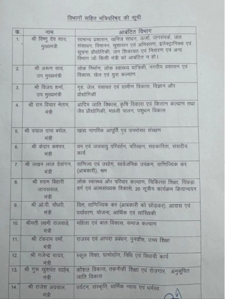 - विष्णु देव साय (मुख्यमंत्री)- सामान्य प्रशासन,स्कूल शिक्षा, उच्च शिक्षा, जनसंपर्क, खनिज साधन, ऊर्जा, वाणिज्यिक कर (आबकारी), परिवहन , धार्मिक न्यास एवं धर्मस्व, पर्यटन व संस्कृति विभाग, अन्य विभाग (जो किसी मंत्री को आबंटित नहीं हुआ हो).