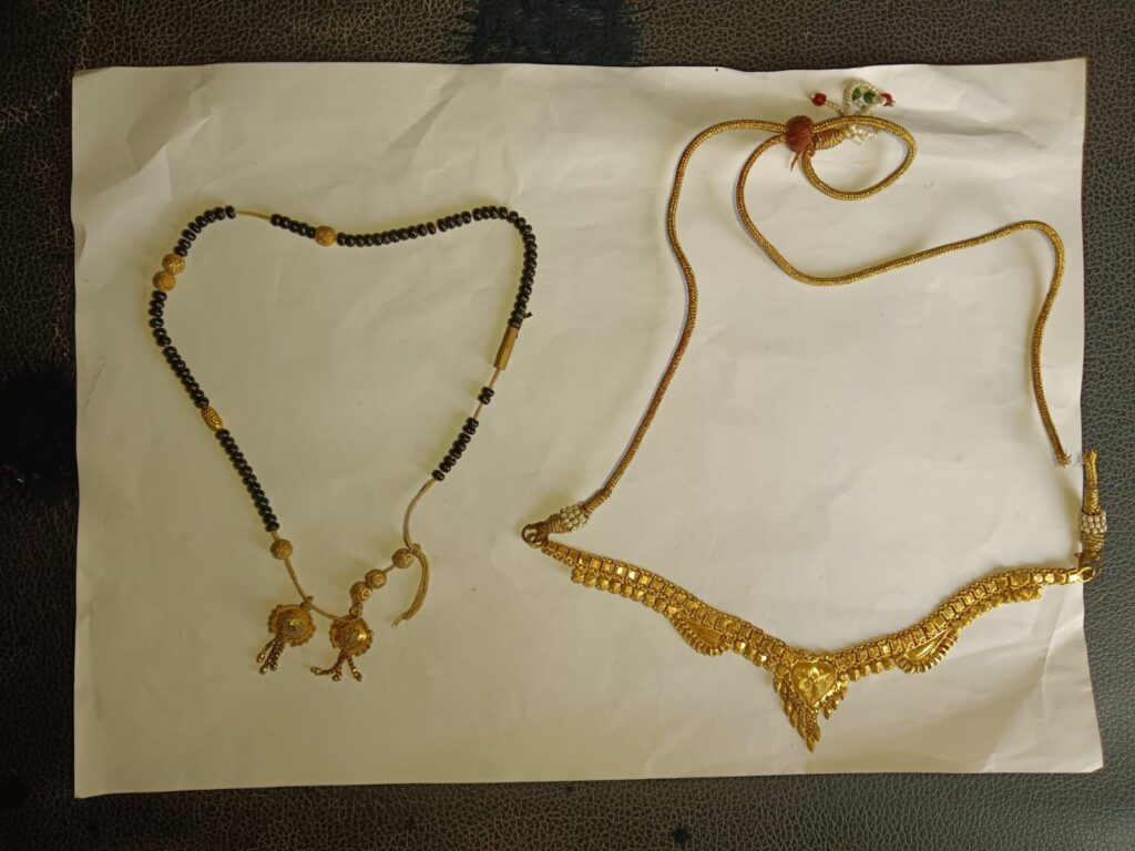 पुलिस अधीक्षक महोदय आंजनेय वार्ष्णेय (भा.पु.से), अतिरिक्त पुलिस अधीक्षक महोदय श्रीमती निमिषा पाण्डेय (रा.पु.से.), एवं अनुविभागीय अधिकारी पुलिस श्री अविनाश मिश्रा (रा.पु.से.) द्वारा हो रहे अवैध जुआ, सट्टा, शराब, चोरी और नशीले मादक पदार्थों पर रोकथाम के लिए दिये गए कड़े निर्देश के परिपालन में थाना प्रभारी कोसीर निरीक्षक सुनीता नाग बंजारे के द्वारा थाना क्षेत्र में मुखबिर तैनात किया गया है कि प्रार्थी भारसिंह यादव पिता गणेश राम यादव उम्र 60 साल साकिन पाट थाना कोसीर जिला सारंगढ बिलाईगढ थाना उपस्थित आकर लिखित रिपोर्ट दर्ज कराया कि दिनांक घटना 26.09.2025 के रात्रि करीबन 01 बजे ग्राम पाट मां दुर्गा मंदिर में मां दुर्गा की मूर्ति में पहने 01 तोला सोना की हार एवं 01 नग सोना की माला कुल कीमती 1,20,000 रूपये को किसी अज्ञात चोर द्वारा चोरी कर ले गया है कि रिपोर्ट पर वरिष्ठ अधिकारियों को सूचित कर अपराध धारा 331(4)305 बीएनएस कायम कर जांच पतासाजी में लिया गया था कि मुखबीर सूचना मिला कि ग्राम पाट का भूलोचन रत्नाकर पिता शंकर रत्नाकर के द्वारा उक्त घटना को अंजाम दिया है कि सूचना पर रवाना होकर संदेही/आरोपी भूलोचन प्रसाद रत्नाकर पिता शंकर रत्नाकर उम्र 24 वर्ष साकिन पाट थाना कोसीर को कडाई से पुछताछ करने पर अपना जुर्म स्वीकार कर मेमोरेण्डम कथन लिया गया जो अपने कथन में बताया कि ग्राम पाट के सक्राम नाला के किनारे मिटटी में खोदकर रखा हूं बरामद करा देता हूं कहने पर मौकास्थल पहुंचकर उक्त चोरी गयी एक तोला सोने की हार एवं एक सोने की माला कीमती लगभग 1,20,000 रू तथा घटना में प्रयुक्त ब्लेड को आरोपी द्वारा बरामद करने पर समक्ष गवाहन जप्त कर कब्जा पुलिस में लिया गया है आरोपी भूलोचन रत्नाकर पिता शंकर रत्नाकर उम्र 24 साल ग्राम पाट थाना कोसीर को गिरप्तार कर सूचना परिजन को देकर न्यायिक रिमाण्ड पर भेजा गया है ।
