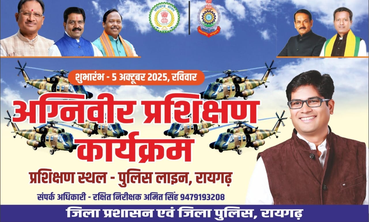 रायगढ़ । शासन की महत्वाकांक्षी अग्निवीर योजना के तहत लिखित परीक्षा में सफल अभ्यर्थियों को आगामी फिजिकल टेस्ट की तैयारी हेतु पुलिस विभाग द्वारा विशेष प्रशिक्षण प्रदान किया जाएगा। वित्त मंत्री श्री ओपी चौधरी सर के निर्देशों के अनुपालन में जिला प्रशासन और जिला पुलिस इस वर्ष भी प्रशिक्षण शिविर का आयोजन कर रहे हैं। कलेक्टर श्री मयंक चर्तुवेदी और पुलिस अधीक्षक श्री दिव्यांग कुमार पटेल के मार्गदर्शन में आयोजित इस शिविर में अभ्यर्थियों को नि:शुल्क रहने-खाने की सुविधा के साथ पुलिस ट्रेनर्स द्वारा शारीरिक दक्षता की पूर्ण ट्रेनिंग दी जाएगी। प्रतिभागियों को प्रशिक्षण के दौरान आवश्यक उपकरण और कीट भी नि:शुल्क उपलब्ध कराए जाएंगे। शिविर का उद्देश्य युवाओं को शारीरिक और मानसिक रूप से सशक्त बनाकर “अग्निवीर” योजना में अधिकतम चयन सुनिश्चित करना है। प्रशिक्षण के दौरान समय-समय पर मोटिवेशनल सेशन आयोजित किए जाएंगे, जिससे अभ्यर्थियों में आत्मविश्वास और अनुशासन विकसित हो। विशेष प्रशिक्षण शिविर का विधिवत शुभारंभ 5 अक्टूबर 2025 से पुलिस लाइन उर्दना में किया जाएगा। यह संदेश अधिक से अधिक चयनित अभ्यर्थियों तक पहुंचे, इसलिए मीडिया साथी, नागरिकों एवं सभी अभ्यर्थियों से अनुरोध है कि वे अपने मित्रों, संबंधियों और परिचितों को भी इस अवसर की जानकारी दें जिससे लिखित परीक्षा उत्तीर्ण अभ्यर्थी प्रशिक्षण में सम्मिलित होने हेतु निरीक्षक अमित सिंह (मोबाइल: 9479193208) से संपर्क कर शिविर का लाभ उठा सकें ।