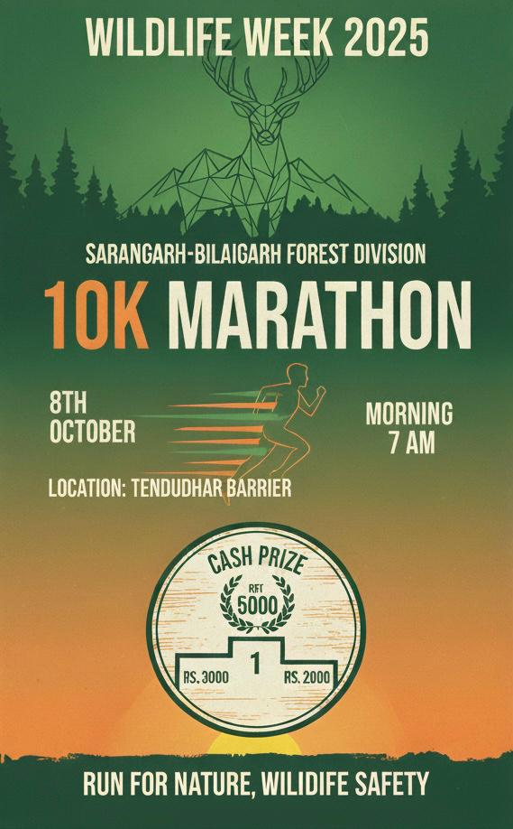 सारंगढ़ बिलाईगढ़/वन विभाग द्वारा वाइल्ड लाइफ वीक 2025 अंतर्गत सारंगढ़ बिलाईगढ़ जिले के वन डिविजन में सारंगढ़ तहसील में केडार के पास तेंदूढार बैरियर में “रन फॉर नेचर, विल्ड लाइफ सेफ्टी” थीम पर दशक मैराथन (दौड़) का आयोजन 8 अक्टूबर को सुबह 7 बजे किया जाएगा। इसमें विजेताओं को पुरस्कार 5000, 3000 और 2000 रुपए प्रदान किया जाएगा।
