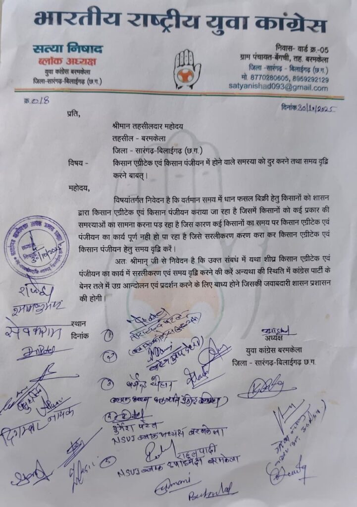 बरमकेला : राष्ट्रीय युवा कांग्रेस बरमकेला ने ताराचंद पटेल के नेतृत्व एवं सत्या निषाद के अगुवाई मे तहसीलदार को ज्ञापन सौपते हुए कहा है की एग्रीटेक पंजीयन की जतिलता कम करके पंजीयन की तिथि मे बढ़ोत्तरी करना किसान हितकारी साबित होगा।
