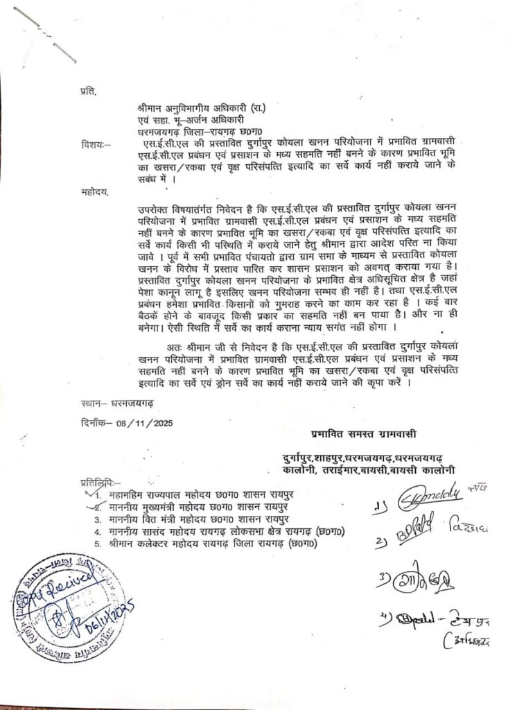 एस.ई.सी.एल. की प्रस्तावित दुर्गापुर कोयला खनन परियोजना को लेकर क्षेत्र के ग्रामीणों में भारी असंतोष व्याप्त है। प्रभावित ग्रामों — दुर्गापुर, शाहपुर, धरमजयगढ़, धरमजयगढ़ कालोनी, तराईमार, बायसी एवं बायसी कालोनी — के ग्रामवासियों ने अनुविभागीय अधिकारी (राजस्व) एवं सहायक भू-अर्जन अधिकारी, धरमजयगढ़ को सामूहिक निवेदन पत्र सौंपकर इस परियोजना से संबंधित सर्वे कार्य को तत्काल प्रभाव से रोकने की मांग की है। ग्रामीणों ने अपने आवेदन में उल्लेख किया है कि प्रस्तावित कोयला खनन परियोजना को लेकर अब तक एस.ई.सी.एल. प्रबंधन और प्रभावित किसानों के बीच किसी भी प्रकार की सहमति नहीं बन पाई है। इसके बावजूद प्रभावित भूमि का खसरा, रकबा एवं वृक्ष परिसंपत्ति संबंधी सर्वे करने की तैयारी प्रशासन द्वारा की जा रही है, जो ग्रामीणों के अनुसार न्यायसंगत नहीं है।और वहीं ग्रामीणों ने यह भी कहा है कि पूर्व में सभी प्रभावित पंचायतों द्वारा ग्राम सभाओं के माध्यम से इस परियोजना के विरोध में प्रस्ताव पारित कर शासन-प्रशासन को अवगत कराया जा चुका है। चूंकि यह पूरा क्षेत्र अधिसूचित क्षेत्र है और यहां पेशा कानून लागू है, इसलिए बिना ग्राम सभा की सहमति के किसी भी प्रकार की खनन गतिविधि या सर्वे कराना कानून के विरुद्ध होगा।
