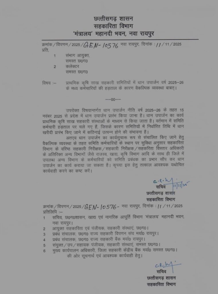 पत्र में कहा गया है कि प्रदेश में धान खरीदी का कार्य प्राथमिक कृषि साख सहकारी समितियों के माध्यम से किया जाता है, लेकिन वर्तमान में समिति कर्मचारी हड़ताल पर हैं, जिसके कारण समितियों में धान उपार्जन कार्य प्रभावित हो सकता है। इस स्थिति में शासन ने स्पष्ट किया है कि समिति कर्मचारियों के स्थान पर सहकारिता विभाग के वरिष्ठ सहकारी निरीक्षक, सहकारी निरीक्षक, सहकारिता विस्तार अधिकारी सहित अन्य विभागों- जैसे राजस्व, खाद्य एवं कृषि विभाग के कर्मचारियों को समिति प्रबंधक का प्रभार देकर धान खरीदी का कार्य कराया जा सकता है।