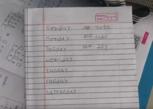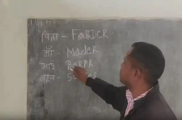 टीचर जी बच्चों को अंग्रेजी में दिनों के नाम करवा रहे हैं। जहां वे ब्लैकबोर्ड पर SUNDAY-MONDAY लिख रहे हैं लेकिन उन्हें खुल को स्पैलिंग का ज्ञान नहीं है। टीचर जी ने ‘Sunday’ को ‘Sanday’ और ‘Wednesday’ को ‘Wensday’ लिखा है। वहीं बच्चे टीचर जी की गल्तियों को दोहरा रहे हैं।