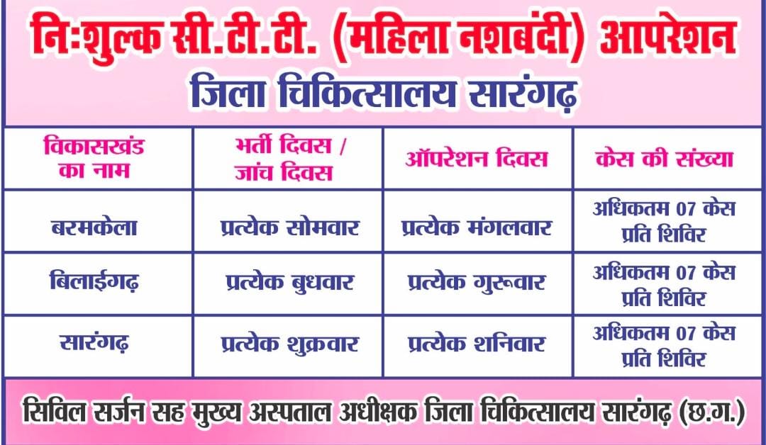 निःशुल्क सी.टी.टी. (महिला नसबंदी) अभियान को मिली रफ्तार, जिला अस्पताल सारंगढ़ बना भरोसे का केंद्र…