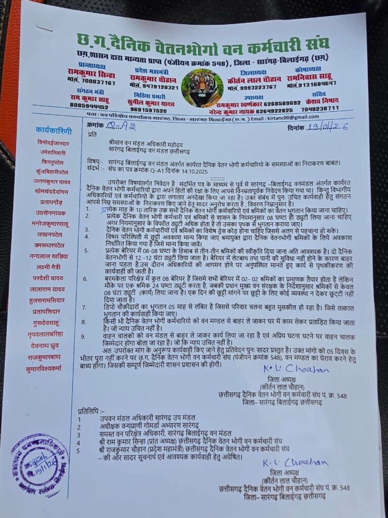सारंगढ़-बिलाईगढ़ वन मंडल अंतर्गत कार्यरत दैनिक वेतनभोगी कर्मचारियों एवं श्रमिकों की समस्याओं को लेकर बड़ा मामला सामने आया है। दैनिक वेतनभोगी वन कर्मचारी संघ ने वन मंडल अधिकारी को पत्र लिखकर वेतन भुगतान, ड्यूटी समय, अवकाश, सुविधाओं एवं मानसिक प्रताड़ना से जुड़ी गंभीर अनियमितताओं की ओर ध्यान आकृष्ट कराया है।