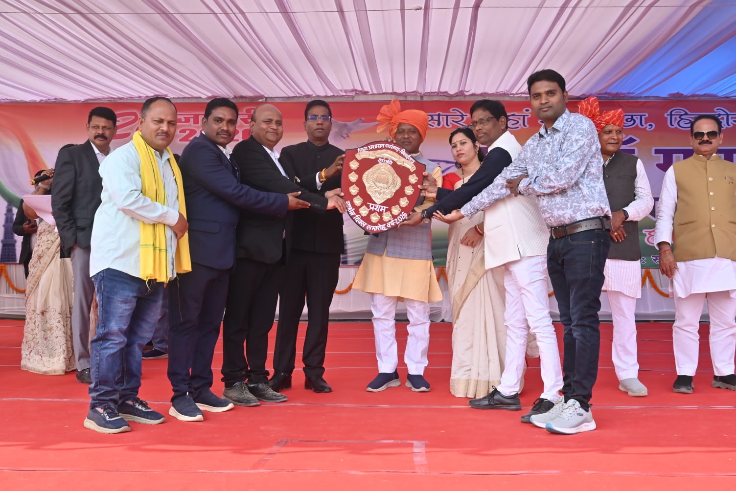 समारोह के मुख्य अतिथियों—रायगढ़ सांसद श्री राधेश्याम राठिया, सारंगढ़ विधायक श्रीमती उत्तरी गनपत जांगड़े और कलेक्टर डॉ. संजय कन्नौजे ने संयुक्त रूप से आदिवासी विकास विभाग की टीम को प्रथम पुरस्कार के रूप में शील्ड और प्रशस्ति पत्र प्रदान कर सम्मानित किया। विभाग की ओर से सहायक आयुक्त श्री बद्रीश सुखदेवे, कनिष्ठ लेखाधिकारी श्री शिवकुमार महिलांगे और खंड प्रभारी श्री विमल कुमार अजगल्ले ने यह सम्मान ग्रहण किया।