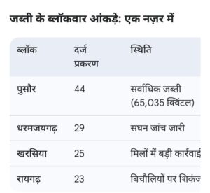अवैध धान के खेल में इस बार पुसौर ब्लॉक सबसे हॉटस्पॉट बनकर उभरा है। ओडिशा की सीमा से लगे होने के कारण तस्करों ने यहाँ सबसे ज्यादा सेंध लगाने की कोशिश की। आंकड़ों की मानें तो अकेले पुसौर में 44 प्रकरणों में 65,035 क्विंटल धान जब्त किया गया है। यह जिले की कुल जब्ती का लगभग आधा हिस्सा है, जो बताता है कि सीमावर्ती इलाकों में प्रशासन की चौकसी कितनी सख्त रही है।