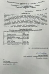 यह नियुक्तियां वर्ष 2024 की चयन सूची के तहत 1 जनवरी 2024 से 31 दिसंबर 2024 के बीच उत्पन्न रिक्तियों के आधार पर की गई हैं। सभी अधिकारियों को प्रोबेशन पर नियुक्त करते हुए भारतीय प्रशासनिक सेवा में शामिल किया गया है और उन्हें छत्तीसगढ़ कैडर आवंटित किया गया है।