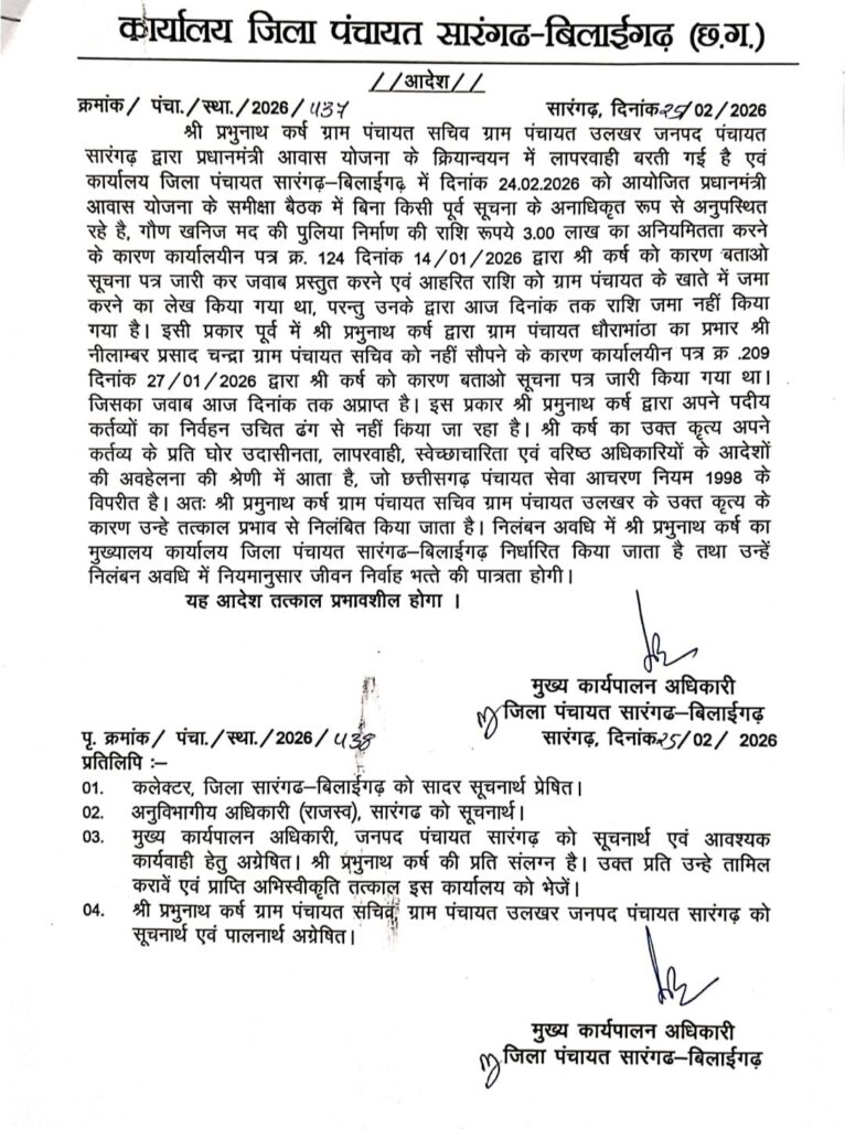 - लापरवाही और वित्तीय अनियमितता पर पंचायत सचिव निलंबित…. - February 25, 2026
