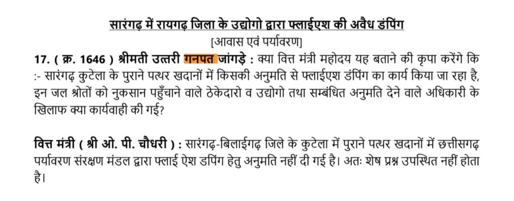 सारंगढ़ में फ्लाई ऐश डंपिंग पर सियासी घमासान, विधायक उत्तरी जांगड़े के सवाल से घिरी सरकार…विधायक उत्तरी जांगड़े के सवाल पर सरकार ने कहा – किसी को नहीं दी गई अनुमति…