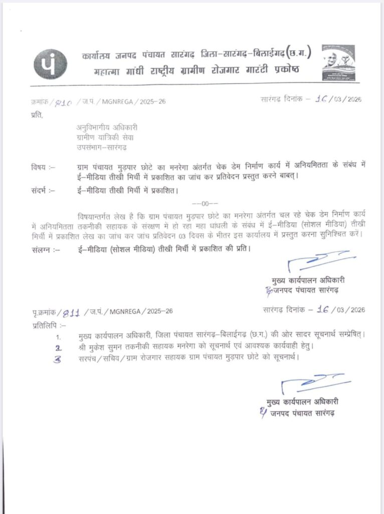 पत्रकारिता की इस सजगता को संज्ञान में लेते हुए मुख्य कार्यपालन अधिकारी (CEO), जनपद पंचायत सारंगढ़ ने कड़ा रुख अपनाया है। जारी किए गए आधिकारिक पत्र (क्रमांक 810/ज.पं./MGNREGA/2025-26) के अनुसार