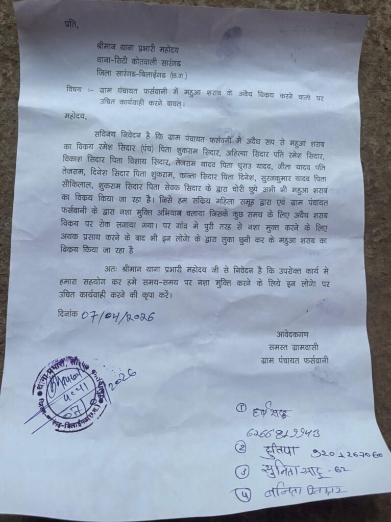 ग्राम फर्सवानी की पीड़ित महिलाओं ने आज हिम्मत जुटाकर एक सप्ताह के भीतर दूसरी बार सारंगढ़ थाना का दरवाजा खटखटाया। उनकी गुहार एक ही थी: “उनके गांव को इस जहर से बचा लो।”
