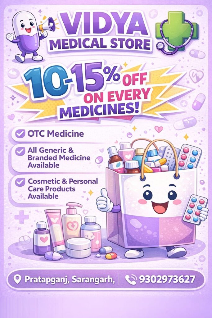 सारंगढ़: विद्या मेडिकल स्टोर की अनूठी पहल, अब हर दवाई पर मिलेगी 10% से 15% तक की भारी छूट…संचालक मनीष पटेल का बड़ा फैसला…महंगाई के दौर में आम जनता को स्वास्थ्य सेवाओं में मिलेगी बड़ी राहत…